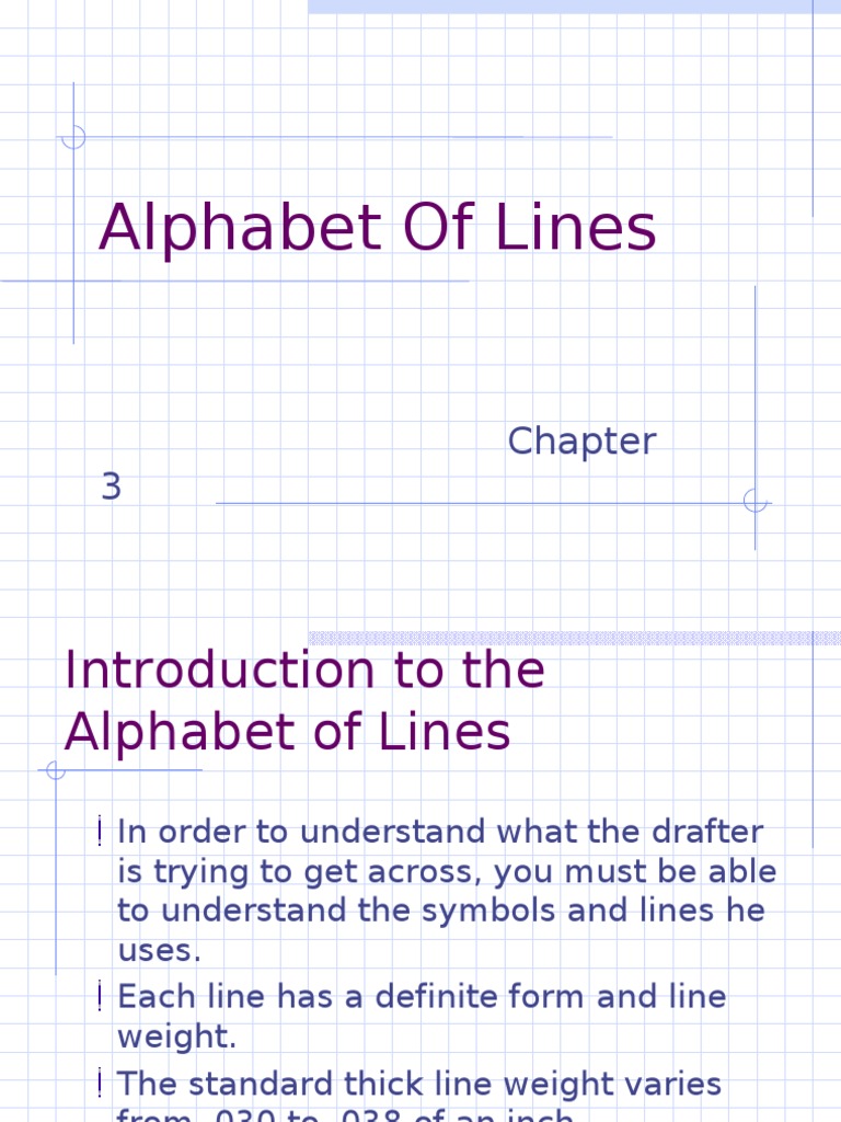 Alphabet of lines lines are the critical component of sketching lines have different types. ▫ used for dimensioning and notes. Introduction to the alphabet of lines, and description of object lines. The alphabet of lines is needed for technical drawings because it used to describe shape, size, hidden surfaces, interior detail, . The use of line symbols enables engineers/designers to express the features . Line weight is the thickness of the line. Learn how to choose a line of credit. tagalog grade 8 math lesson: Thin line consisting of long and short dashes. Centerlines are used so that the short dashes cross in the center. Correct usage of this alphabet of lines is essential whether you use traditional drafting methods or cad. Shows the center of holes, slots, paths of rotation, and symmetrical objects. Technical drawing & alphabet of line | schoolworkhelper.