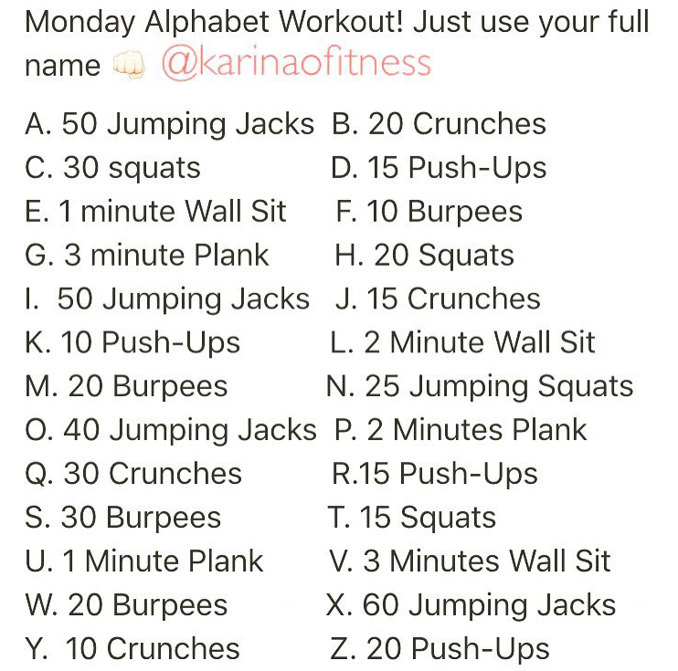 2 from Anschließend könnt ihr den schüler*innen (beispielsweise täglich) . Start the week out right with this easy fun workout. Fibromyalgia can be a painful condition that decreases your quality of life. Fitting in a full workout each day sounds great, but it's nearly impossible for many people. See more ideas about workout, alphabet workout, spell your name workout. Dan cockerell workout of the day alphabet workout capture. Spell your name or complete the entire alphabet workout challenge. One of our girls found this alphabet workout online so we have been having fun with it in class!